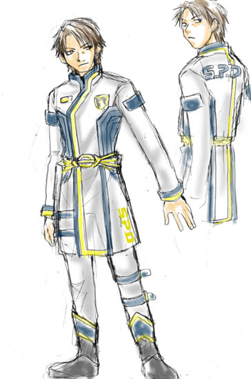 | ★5年後のホージー★ なんとなく…なんですが、あたし内ではホージーはバンと溜め年、 それより一つ下センちゃん・ウメコ・ジャスミン、一番年下、テツなイメージでして、 ゆえに5年後ホーさんは27歳で。 バンがFS移動後、一年後にはホージーも特キョウとして本部へ移動。 しばらく、第二班でチーフを務め、そして最近、異例の速さで昇進を受け、 現在、特凶課・課長。テツの上司になりました。(笑) (ちなみに特キョウ内の階級…といいますかは班長(チーフ18名)→係長(6名)→課長(3名)→部長(1名)とあり、 (現在部長にいるのはリサさん。)というのはどうだろう?←誰に向かって言っている。) こういっちゃナンですが、ホージーが一番、地球署SPDの中じゃ、出世欲…というか向上心のある人だと思うので、 元々、エリート出身でもあるし、努力の人でもあるし、一番、出世してそうだなあ…と。 ていうか、中間管理職似合いそうじゃん、ホージー。 ゆえに制服を、ちょっぴり上司仕様に(笑)と思いつつ、 ボスの衣装を下地にいじりまくりました。 でも、特キョウだし、カラーリングはお約束の白地で…と思いつつも しかし…すんません、自分で描いといてナンですが どこの王子様ですか?!この人?!(汗) な具合に。 |