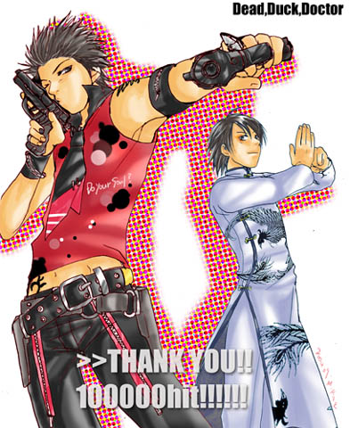 ★10万打有難うございます★ おかげさまで10万打という節目を迎えることができました。 その記念にしばらくフリーイラストにさせていただいておりました。 イメージは「マフィアの殺し屋」(刑事なのに?)ですた。 バンの格好がいささかやりすぎたかと、チョト反省。 テチュのチャイナは…ほれ、アイドルだし。
