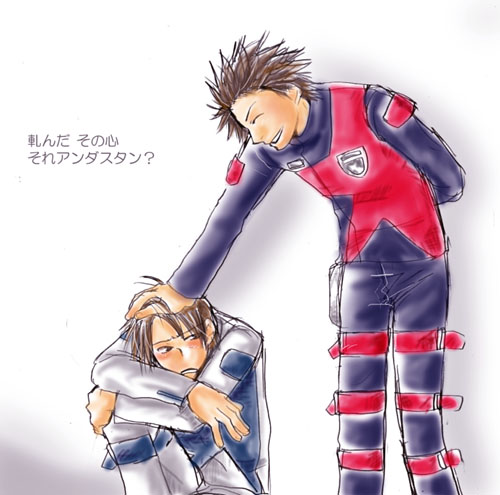 33.「甘え」 誰より一番「子供」なくせに 「子供」扱いされることには全然慣れていない。 誰かに「甘える」こともそれは「弱さ」だと勘違いする どうしようもない「子供」のくせに。 テツの手は「も〜先輩、あっち行ってくださいよ、シッシッ!」 の手つきのつもりなんですが… プラウザバックでお戻りください